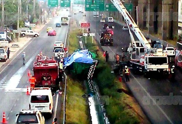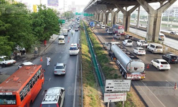 วันนี้ (16 เมษายน 2557) เวลาประมาณ 03.30 น. บริเวณถนนพหลโยธินขาออก หน้าห้างแม็คโคร ต.ประชาธิปัตย์ อ.ธัญบุรี เกิดเหตุรถน้ำมันพลิกคว่ำ เมื่อเจ้าหน้าที่ตำรวจ สภ.ประตูน้ำจุฬาลงกรณ์ จ.ปทุมธานี เข้ามาตรวจสอบ พบว่า รถดังกล่าวเป็นรถสิบล้อ ยี่ห้ออีซูซุ สีขาว ป้ายทะเบียน 61-6534 กรุงเทพมหานคร ของบริษัทเอสซี แคริเออร์ จำกัด บรรทุกน้ำมันประมาณ 6,000 ลิตร อยู่ในสภาพพลิกตะแคง ตกร่องระบายน้ำกลางถนน ระหว่างช่องทางด่วนและช่องทางคู่ขนาน ส่งผลให้น้ำมันไหลรั่วลงท่อระบายน้ำและไหลเต็มพื้นถนน