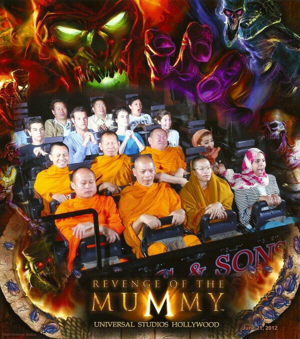 รายงานระบุว่า พระสงฆ์กลุ่มดังกล่าวได้เล่นเครื่องเล่นประเภทที่เรียกว่า Revenge of the Mummy ซึ่งเป็นเครื่องเล่นให้ผู้เล่นขึ้นนั่งรถรางเข้าไปผจญภัยในอุโมงค์ตามแบบฉบับภาพยนตร์ดังของค่ายยูนิเวอร์แซล สาขาฮอลลีวูด มลรัฐแคลิฟอร์เนีย โดยภาพดังกล่าวถ่ายเมื่อ 21 มิถุนายน 2012 (2555)