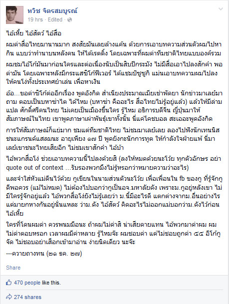 ผมด่าสื่อไทยมานานมาก สงสัยมันเลยล้างแค้น ด้วยการเอาบทความส่วนตัวผมไปหากิน แบบว่าทำนาบนหลังคน ให้ได้เรตติ้ง โดยเฉพาะที่ผมด่าทีมชาติไทยแบบองค์รวม