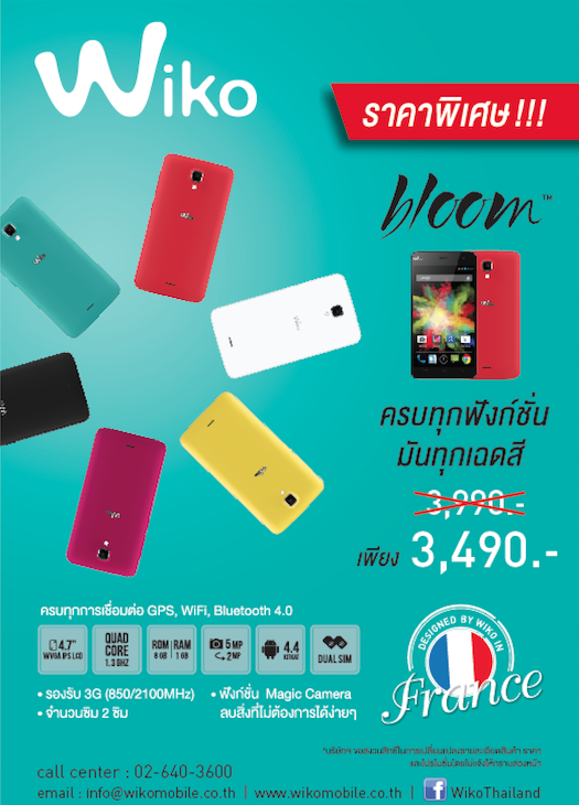Wiko Bloom สมาร์ทโฟนแบรนด์ใหม่จากฝรั่งเศส ด้วย"ครบเครื่องทุกฟังก์ชั่น มันทุกเฉดสี" ปรับราคาพิเศษ!! เหลือเพียง 3,490 บาท จากเดิม 3,990 บาท เป็นเจ้าของได้แล้ววันนี้ ที่ตัวแทนจำหน่ายใกล้บ้านคุณ หรือสั่งซื้อออนไลน์ได้ที่ www.lazada.co.th/Wiko และ www.shopat7.com/mobile/Wiko