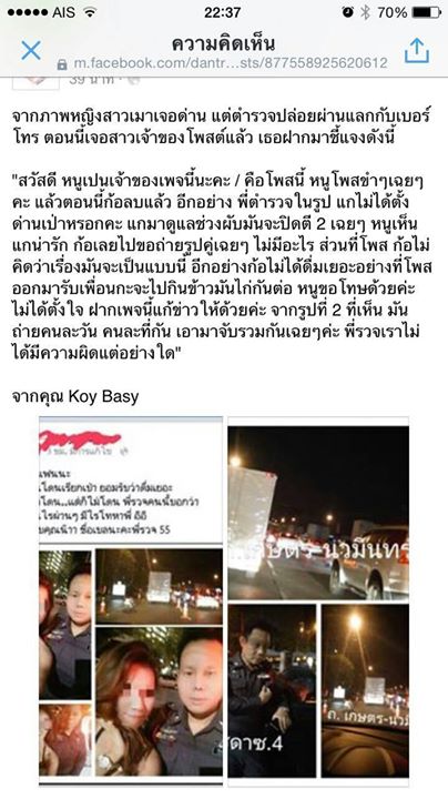 "สวัสดีค่ะ หนูเป็นเจ้าของเพจนี้นะคะ / คือโพสต์นี้หนูโพสต์ขำ ๆ เฉย ๆ ค่ะ แล้วตอนนี้ก็ลบแล้ว อีกอย่าง พี่ตำรวจในรูปแกไม่ได้ตั้งด่านเป่าหรอกค่ะ แกมาดูแลช่วงผับมันจะปิดตี 2 เฉย ๆ หนูเห็นแกน่ารักก็เลยไปขอถ่ายรูปคู่เฉย ๆ ไม่มีอะไร ส่วนที่โพสต์ก็ไม่ได้คิดว่าเรื่องมันจะเป็นแบบนี้ อีกอย่างก็ไม่ได้ดื่มเยอะอย่างที่โพสต์ ออกมารับเพื่อนกะจะไปกินข้าวมันไก่ด้วยกันต่อ หนูขอโทษด้วยค่ะ ไม่ได้ตั้งใจ ฝากเพจนี้แก้ข่าวให้ด้วยค่ะ จากรูปที่ 2 ที่เห็นมันถ่ายคนละวัน คนละที่กัน เอามาจับรวมกันเฉย ๆ ค่ะ พี่ตำรวจเราไม่ได้มีความผิดแต่อย่างใด"