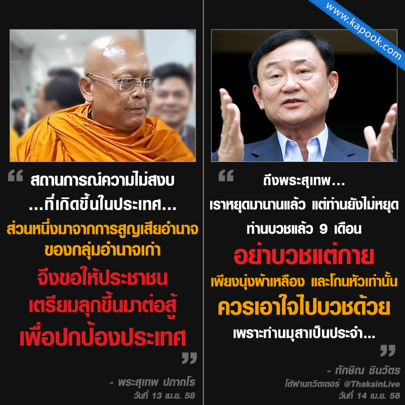 เมื่อวันที่ 14 เมษายน 2558 ทวิตเตอร์ @ThaksinLive ของ พ.ต.ท. ทักษิณ ชินวัตร อดีตนายกรัฐมนตรี มีการทวีตข้อความถึง พระสุเทพ ปภากโร หรือนายสุเทพ เทือกสุบรรณ อดีตเลขาธิการ กปปส. ว่า เราหยุดแล้ว แต่ท่านยังไม่หยุด อย่าบวชเพียงแต่กาย ควรเอาใจไปบวชด้วย เนื่องจากโกหกเป็นประจำ