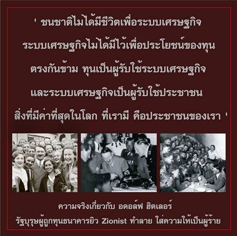 ทั้งนี้เนื่องจากวันนี้เป็นวันคล้ายวันเกิดของ ฮิตเลอร์ตนจึงอยากให้รู้ความจริงอีกด้าน นำเรื่องการแก้เศรษฐกิจกลับมาใช้ในไทยเผื่อวันหนึ่งเราโดนโจมตีค่าเงินบาท และเงินในคลังไม่มีเหลือ นอกจากนี้ประวัติศาสตร์ที่ถูกจารึกโดยผู้ชนะสงคราม นั้นที่แท้จริงฝ่ายพันธมิตร anglo-american ที่รับใช้ทุนธนาคารยิวคือ Zionist ผู้ร้ายตัวจริง ได้ใส่ร้ายบิดเบือนปิดบังความจริงต่าง ๆ นานา รวมถึงเรื่อง Holocaust หรือ การฆ่าล้างเผ่าพันธุ์ อันเป็นเรื่องหลอกลวง ที่ไม่ได้เกิดขึ้นจริงทั้งสิ้น เป็นเพียงการโฆษณาเพื่อใช้ความชอบธรรมในการเข้าไปเข่นฆ่าชาวปาเลสไตน์ เพื่อให้ชาวยิวมีรัฐเป็นของตัวเอง และเพื่อลบความเป็นอัจฉริยภาพทางเศรษฐศาสตร์ของฮิตเลอร์เท่านั้นเอง
