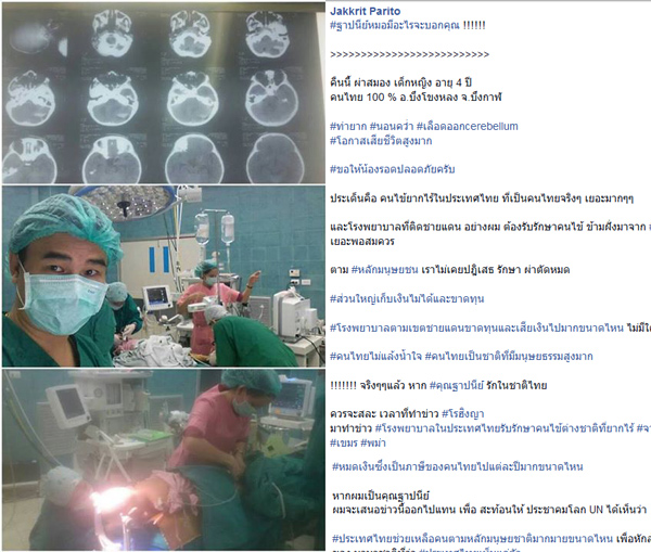 วันที่ 20 พฤษภาคม 2558 ผู้สื่อข่าวรายงานว่า ในโลกออนไลน์มีการแชร์ภาพและข้อความจากเฟซบุ๊ก Jakkrit Parito กันเป็นจำนวนมาก ซึ่งเป็นเฟซบุ๊กของนายแพทย์ท่านหนึ่ง จากโรงพยาบาลสกลนคร โดยภาพและข้อความที่ชาวเน็ตแห่เข้ามาแชร์กันนั้น เป็นภาพขณะที่คุณหมอท่านนี้กำลังจะทำการผ่าตัดสมองของเด็กหญิงคนหนึ่ง เป็นคนไทยแท้ ๆ และเด็กคนนี้มีโอกาสเสียชีวิตสูงมาก ประเด็นคือ คุณหมอท่านนี้ต้องการฝากข้อความถึง น.ส.ฐปณีย์ เอียดศรีไชย นักข่าวชื่อดังของช่อง 3 ว่า คนไข้ยากไร้ในประเทศไทยที่เป็นคนไทยจริง ๆ เยอะมาก และโรงพยาบาลที่ติดชายแดน ต้องรับรักษาคนไข้ข้ามฝั่งจากประเทศเพื่อนบ้านเยอะพอสมควร หากคุณฐปณีย์ รักในชาติไทยจริง ควรจะสละเวลาที่ทำข่าวโรฮีนจา มาทำข่าวโรงพยาบาลในประเทศไทยรับรักษาคนไข้ต่างชาติที่ยากไร้ จากลาว เขมร พม่า แทนไหม ? ให้ประชาคมโลกรับรู้ ประเทศไทยไม่ได้เห็นแก่ตัว !!