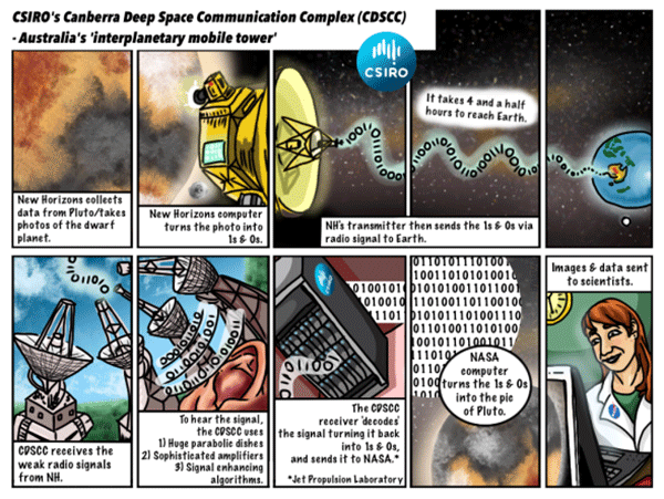 7. จานรับสัญญาณขนาดใหญ่ที่ศูนย์รับสัญญาณอวกาศระดับลึก ในแคนเบอร่า ประเทศออสเตรเลีย จะรับคลื่นวิทยุดังกล่าวซึ่งมีสัญญาณอ่อนกว่าถ่านนาฬิกาถึง 2 หมื่นล้านเท่า เพื่อขยายสัญญาณกลับมาเป็นสัญญาณ 01011010 และส่งต่อกลับมายังนักวิทยาศาสตร์ที่รออยู่ในนาซา เพื่อนำข้อมูลและภาพที่ได้มาใช้ในการศึกษาต่อไป