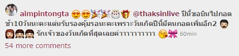 นอกจากนี้ น.ส.พินทองทา (คุณากรวงศ์) ชินวัตร บุตรสาวคนโต ก็ได้โพสต์ข้อความผ่านอินสตาแกรมส่วนตัว aimpintongta ระบุว่า ปีนี้ขอไปกอดช้า 10 วันนะคะ แต่รับรองจะมีคนกอดเพิ่มอีก 2 คน พร้อมโชว์ภาพ พ.ต.ท. ทักษิณ ขณะกำลังหยอกล้อกับลูกแฝดน้อยของเธอ