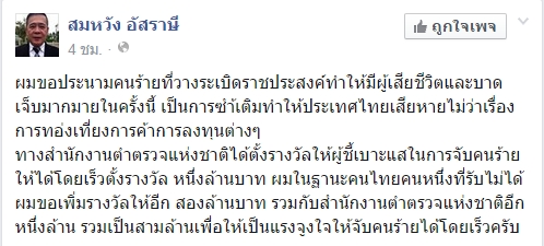 วันที่ 19 สิงหาคม 2558 นายสมหวัง อัสราษี อดีตผู้ช่วยเลขานุการรัฐมนตรีว่าการกระทรวงพาณิชย์ ได้โพสต์ข้อความผ่านทางเฟซบุ๊กส่วนตัว สมหวัง อัสราษี หลังจากที่ทางเจ้าหน้าที่ตำรวจได้มีการเผยแพร่ภาพคนร้ายมือวางระเบิดราชประสงค์ โดยตนยินดีที่จะเพิ่มเงินรางวัลนำจับแก่ผู้ที่แจ้งเบาะแสแก่เจ้าหน้าที่ตำรวจ โดยเนื้อหาระบุดังนี้ ...
