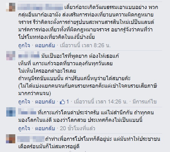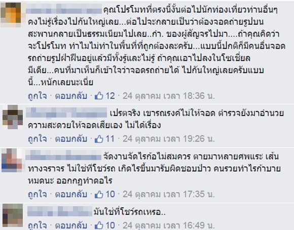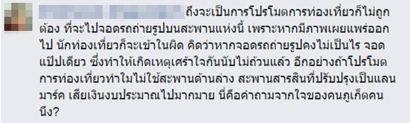 ซึ่งหลังจากนั้นไม่นานก็มีผู้เข้ามาแสดงความคิดเห็นอย่างมากมาย ทั้งมองว่าเรื่องดังกล่าวอาจเป็นการโปรโมทการท่องเที่ยว ขณะที่อีกส่วนมองว่า หากต้องการโปรโมทการท่องเที่ยวจริงก็สามารถไปถ่ายรูปโปรโมทที่อื่นได้ เพื่อไม่ให้กระทบผู้อื่น ที่สำคัญการกระทำแบบนี้ อาจทำให้นักท่องเที่ยวคนอื่นเข้าใจผิดว่า สามารถจอดรถถ่ายรูปบนสะพานได้โดยไม่ผิดกฎหมาย