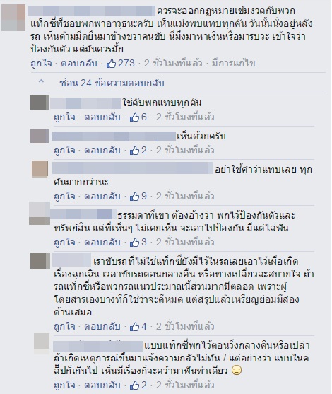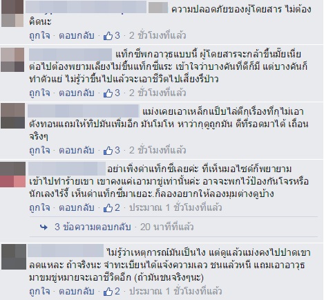ทั้งนี้หลังจากคลิปดังกล่าวได้เผยแพร่ออกไปก็มีชาวเน็ตต่างให้ความสนใจเข้ามาแสดงความคิดเห็นจำนวนมาก โดยส่วนใหญ่ให้ความคิดเห็นว่าควรจะมีกฎหมายเข้มงวดกับแท็กซี่ที่พกอาวุธเพราะเห็นในข่าวเยอะมาก ขณะที่บางส่วนให้ความเห็นว่าไม่ควรไปต่อว่าคนขับแท็กซี่ฝ่ายเดียวเพราะยังไม่รู้สาเหตุที่แน่ชัดและหากมองอีกด้านอาจเป็นฝ่ายบิ๊กไบค์ที่ผิด แต่การที่แท็กซี่นำอาวุธออกออกมาก็เป็นเรื่องที่ไม่สมควร รวมทั้งเรื่องนี้ควรแจ้งเจ้าหน้าที่ตำรวจให้เข้ามาจัดการ