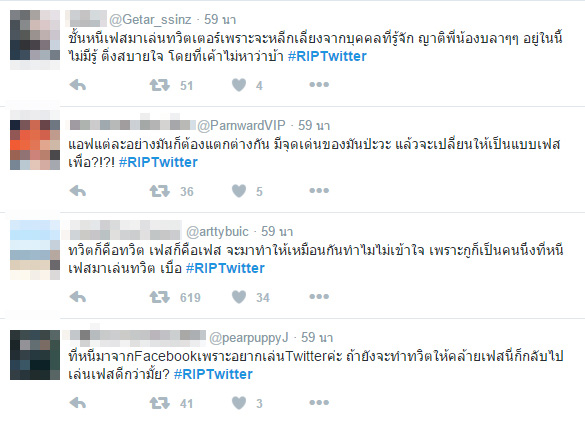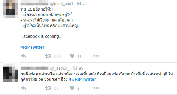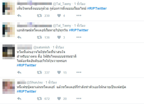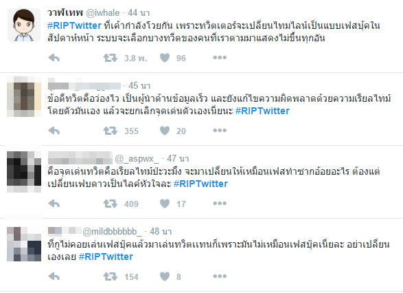 ชาวเน็ตติดแท็ก #RIPTwitter ต้านกระแสเปลี่ยนรูปแบบฟีตของทวิตเตอร์ เป็นไทม์ไลน์ แสดงผลไม่เรียงตามเวลา ลักษณะคล้ายเฟซบุ๊ก