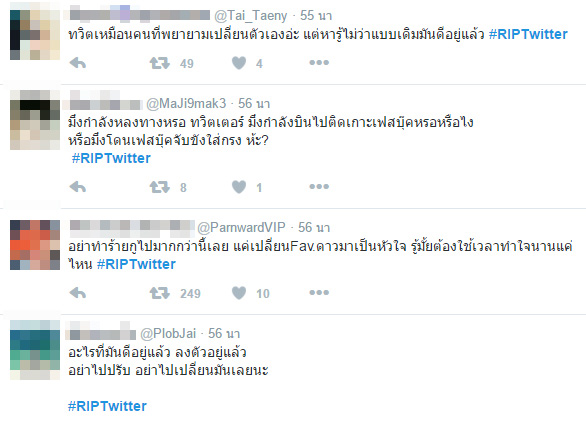 อย่างไรก็ตามแม้การเปลี่ยนแปลงดังกล่าวจะไม่อยู่เหนือความคาดหมายของผู้ใช้ เพราะที่ผ่านมาทางผู้บริหารทวิตเตอร์ก็เคยออกมาแง้มแผนการเปลี่่ยนรูปแบบการแสดงผล แถมยังเคยนำรูปแบบการแสดงผลดังกล่าวมาทดลองใช้กับสมาชิกทวิตเตอร์บางกลุ่ม แต่ชาวเน็ตจำนวนไม่น้อยที่ทราบข่าวต่างก็ออกมาต่อต้านการเปลี่ยนแปลงดังกล่าว โดยเฉพาะชาวเน็ตในประเทศไทย ที่ต่างพร้อมใจกันติดแฮชแท็ก #RIPTwitter