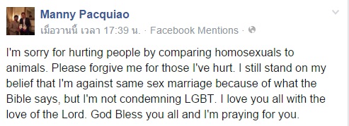โดยล่าสุด (17 กุมภาพันธ์ 2559) มีรายงานว่า แมนนี่ ปาเกียว ได้ออกมาขอโทษผ่านเฟซบุ๊ก Manny Pacquiao โดยระบุว่า ตนขอโทษที่นำคนที่นิยมรักร่วมเพศไปเปรียบเทียบกับสัตว์ ได้โปรดให้อภัยในสิ่งที่ตนทำให้พวกเขาเจ็บปวด ตนไม่ได้ประณามกลุ่มคนรักร่วมเพศแต่เป็นการแสดงจุดยืนถึงความเป็นผู้มีศรัทธาต่อคริสเตียนในแบบอนุรักษนิยม ก่อนทิ้งท้ายว่า ตนเองรักทุกคนด้วยความรักของพระเจ้า ขอพระเจ้าอวยพรคุณทุกคนและตนจะภาวนาเพื่อพวกคุณ