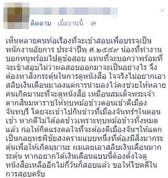 พร้อมทั้งระบุข้อความว่า เห็นหลายคนท้อในการสอบบรรจุเป็นพนักงานอัยการประจำปี 2559 จึงอยากจะหาสิ่งมากระตุ้นในการดูหนังสือ ใจจริงไม่ได้อยากนำสลิปเงินเดือนมาลง แต่ที่เอามาลงไว้ก็เพื่อจะให้หลายคนเกิดกำลังใจในการดูหนังสือ