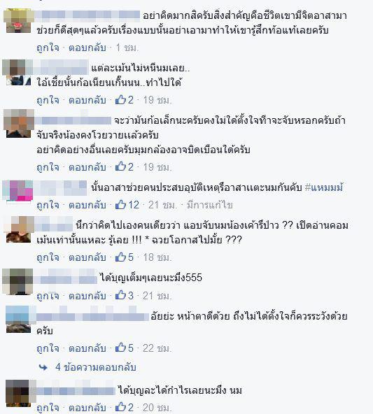 ขณะที่บางส่วนก็มองว่า อาสาฯ ท่านนี้อาจไม่ได้ตั้งใจจะล่วงเกินผู้บาดเจ็บ เพียงแต่เป็นสถานการณ์ในการปฐมพยาบาลก็เป็นได้ และอย่างน้อยเขาก็มีจิตอาสา หากเป็นความไม่ตั้งใจ แต่ถูกตำหนิจากสังคมแบบนี้ อาจทำให้คนดี ๆ หมดกำลังใจช่วยเหลือผู้อื่นต่อไป