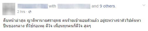 ความคืบหน้าล่าสุด เพื่อนของ น.ส.ศกุนตลา ระบุว่า ญาติ ๆ ได้พานายศรายุทธ เข้ามอบตัวแล้ว ขณะนี้อยู่ระหว่างนำตัวไปค้นหาปืนของกลางที่ใช้ก่อเหตุ