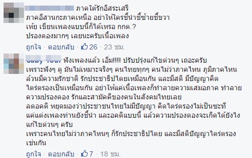 ขณะที่โลกโซเชียลต่างก็มองว่าผู้ที่แต่งเนื้อเพลงนี้ดูจะมีอคติต่อคนทั้ง 2 ภาคข้างต้นเป็นอย่างมาก ขนาดเพลงยังสร้างความขัดแย้งให้เกิดขึ้นได้ มีการดูถูกประชาชน ความปรองดองก็คงยากที่จะเกิด พร้อมกับมีการเรียกร้องให้แต่งเนื้อเพลงใหม่