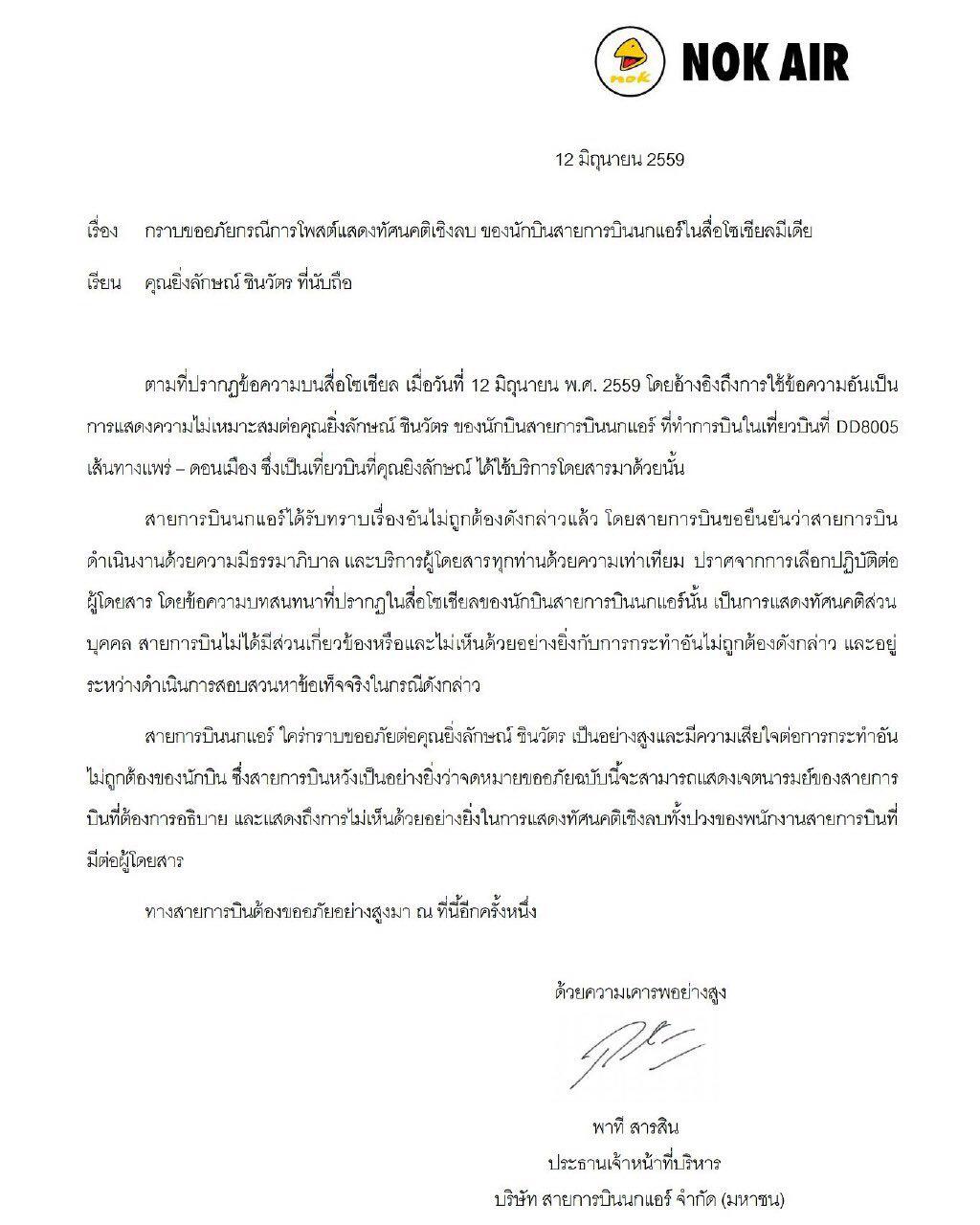 พาที สารสิน เตรียมโทรขอโทษยิ่งลักษณ์ ชินวัตร หลังไลน์กลุ่มผู้ช่วยนักบินเตรียมโหม่งโลกหลุด ยัน นกแอร์ไม่มีการเมือง