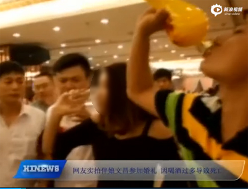 รายงานจากเว็บไซต์เซี่ยงไฮ้อิสต์ ระบุว่า เหตุการณ์นี้เกิดขึ้นกลางงานฉลองวิวาห์ที่โรงแรมเมืองเหวินฉาง มณฑลไห่หนานของจีน เพื่อนเจ้าสาววัย 28 ปี ได้ดื่มเหล้าอย่างสุดเหวี่ยงเพื่อฉลองการสละโสดของเพื่อนสาว เธอสนุกมากและดูเหมือนจะรับทุกคำท้าในการดื่มเหล้า จนในที่สุดก็ไม่อาจทนต่อฤทธิ์แอลกอฮอล์ได้ เมามายจนไม่สามารถควบคุมตัวเองและหมดสติไป
