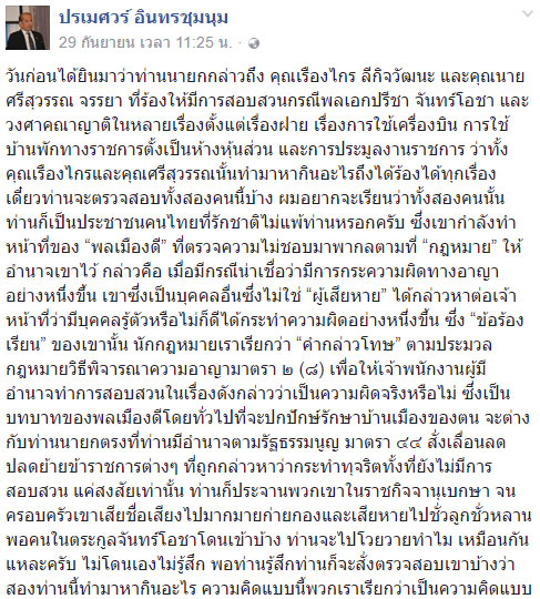 เมื่อวันที่ 5 ตุลาคม 2559 ร.ท. สมนึก เสียงก้อง โฆษกสำนักงานอัยการสูงสุด เปิดเผยว่า อัยการสูงสุดได้มีคำสั่งให้ตรวจสอบข้อเท็จจริงกรณีที่นายปรเมศวร์ อินทรชุมนุม รองอธิบดีอัยการสำนักงานคดีอาญา โพสต์ข้อความลงเฟซบุ๊กกรณีที่นายเรืองไกร ลีกิจวัฒนะ อดีต ส.ว.กรุงเทพฯ และนายศรีสุวรรณ จรรยา เลขาธิการสมาคมองค์การพิทักษ์รัฐธรรมนูญ เรียกร้องให้สอบสวน พล.อ. ปรีชา จันทร์โอชา อดีตปลัดกระทรวงกลาโหม และมีข้อความพาดพิงถึง พล.อ. ประยุทธ์ จันทร์โอชา นายกรัฐมนตรี และนายวิษณุ เครืองาม รองนายกรัฐมนตรี