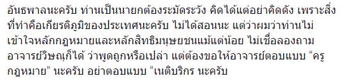 ทั้งนี้โฆษกสำนักงานอัยการสูงสุด กล่าวต่อไปว่า กรณีนี้เป็นการแสดงความเห็นส่วนบุคคล ไม่เกี่ยวกับสำนักงานอัยการสูงสุด และทางสำนักงานอัยการสูงสุด ได้มีหนังสือเวียนกำชับบุคคลในองค์กรปฏิบัติตามระเบียบอย่างเคร่งครัด เรื่อง การให้ข่าวและบริการข่าวสาร พ.ศ. 2554 ข้อ 13 เรื่องกำหนดการเขียนบทความเผยแพร่สามารถทำได้ แต่ต้องอยู่ในกรอบกฎหมาย และไม่สร้างความเสียหายต่อองค์กร
