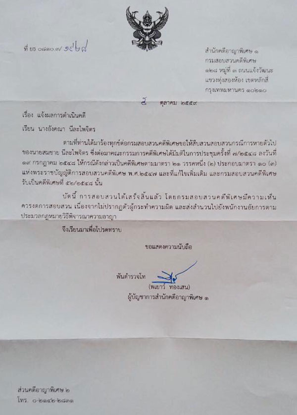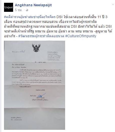 นอกจากนี้ นางอังคณา ยังโพสต์เอกสารจากทาง สำนักคดีอาญาพิเศษ 1 กรมสอบสวนคดีพิเศษ ลงวันที่ 5 ตุลาคม 2559 ซึ่งแจ้งว่า คดีดังกล่าวได้สอบสวนเสร็จสิ้นแล้ว โดยกรมสอบสวนคดีพิเศษมีความเห็นว่าควรงดการสอบสวน เนื่องจากไม่ปรากฏตัวผู้กระทำความผิด และส่งสำนวนไปยังพนักงานอัยการตามประมวลกฎหมายวิธีพิจารณาความอาณา