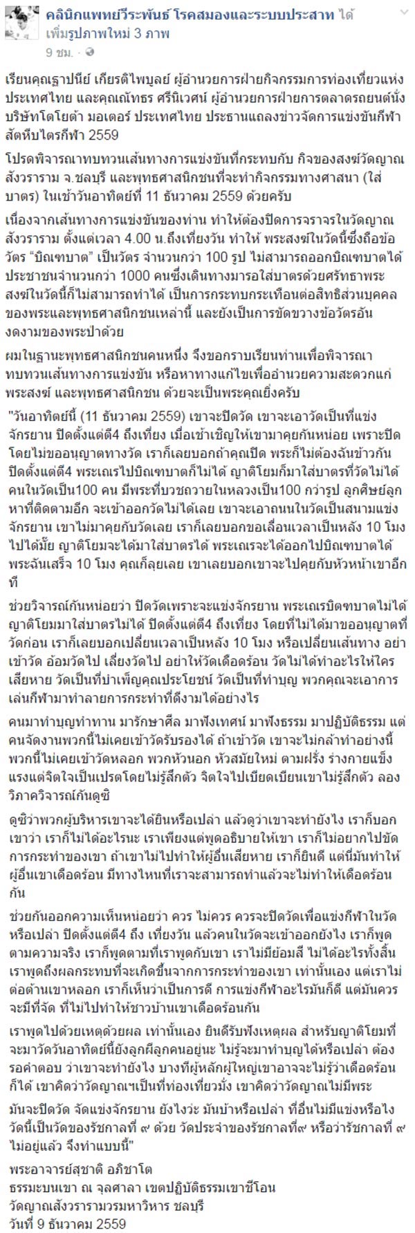 นอกจากนี้ นพ.วีระพันธ์ ยังยกคำกล่าวของ พระอาจารย์สุชาติ อภิชาโต ที่ระบุว่า ในวันที่ 11 ธันวาคม วัดต้องปิดชั่วคราวเพราะมีการจะใช้เป็นที่แข่งจักรยาน ซึ่งเรื่องนี้มีผลกระทบต่อพระและญาติโยม โดยทางวัดได้มีการเรียกฝ่ายจัดมาคุยให้เลื่อนไปเป็นช่วง 10.00 น. แต่ก็ยังไม่ได้รับการยืนยันใด ๆ โดยอันที่จริงเรื่องกีฬาไม่ควรมาทำลายการกระทำดีงาม อีกอย่างวัดนี้เป็นวัดของรัชกาลที่ 9 ซึ่งผู้ที่จัดควรจะมีความเกรงใจในเรื่องนี้บ้าง