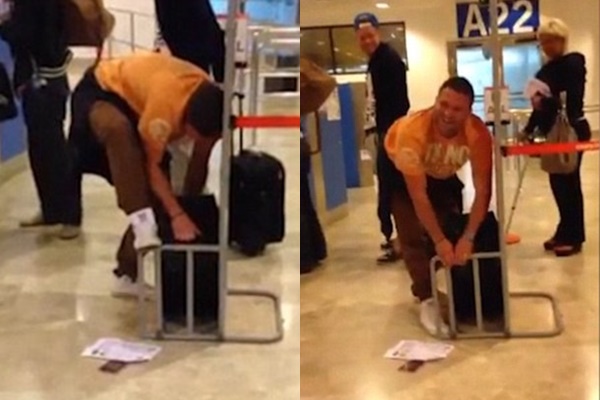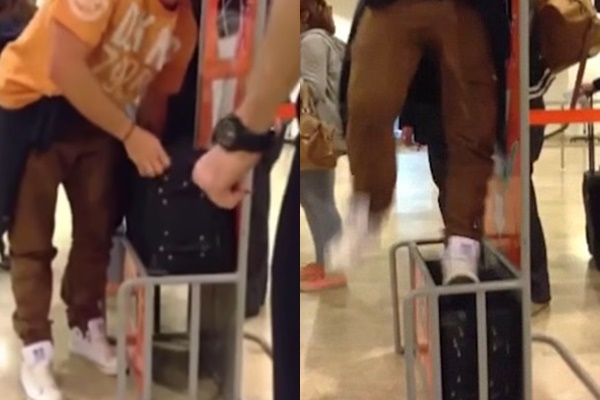 แต่แล้วหนุ่มรายนี้ต้องเป็นฝ่ายเดือดร้อนเสียเอง เพราะเมื่อถึงเวลาดึงออกมา กระเป๋าที่ถูกเขากระโดดเหยียบนั้นดันติดแหง็กอยู่ในที่วัดจนเอาไม่ออก เจ้าตัวเลยต้องพยายามออกแรงทั้งงัดทั้งดึงอยู่สักพักกว่าจะออกมา ท่ามกลางสายตาผู้คนในสนามบินที่หันมามองกันเป็นตาเดียวและอดที่จะขำไม่ได้