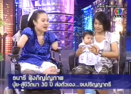 เธอคนนี้เกิดมาร่างกายไม่สมบูรณ์ ไม่มีแขน ไม่มีขา แต่เธอกลับสู้ชีวิตปัจจุบันเธอสามารถเลี้ยงตัวเอง ที่สำคัญเธอทำงานส่งตัวเองเรียนจนจบปริญญาตรี เธอต่อสู้กับความพิการและใช้ชีวิตเหมือนคนปกติในสังคมได้อย่างดี นั่นก็คือ นุ้ย หรือ นางสาวธนารี ฟุ้งภิญโญภาพ อายุ 29 ปี จบการศึกษาจากมหาวิทยาลัยสุโขทัยธรรมาธิราช คณะนิเทศศาสตร์ เอกประชาสัมพันธ์ โดยใช้เวลาศึกษาเล่าเรียนเพียง 3 ปีครึ่ง เพราะเธอเชื่อมั่นมาโดยตลอดว่า "ถ้ามีความรู้ ย่อมมีโอกาสได้งานที่ดีทำ" ปัจจุบันทำงานอยู่ที่ศูนย์คณะพระมหาไถ่ พัทยา ในตำแหน่งรับจองห้องพัก