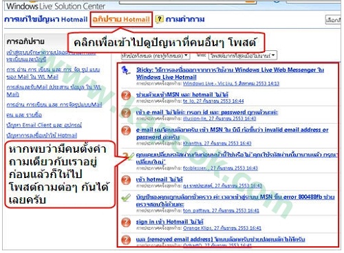 11. เราสามารถเข้าไปดูปัญหาที่ผู้ใช้ Hotmail คนอื่นๆ มาโพสต์ไว้ได้