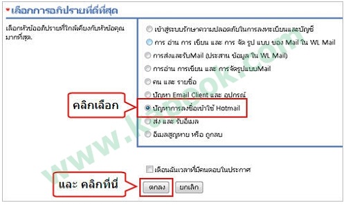 9. สกอร์ลงมาด้านล่าง ให้คลิกเลือก ปัญหาการลงชื่อเข้าใช้ Hotmail จากนั้นคลิกปุ่ม ตกลง