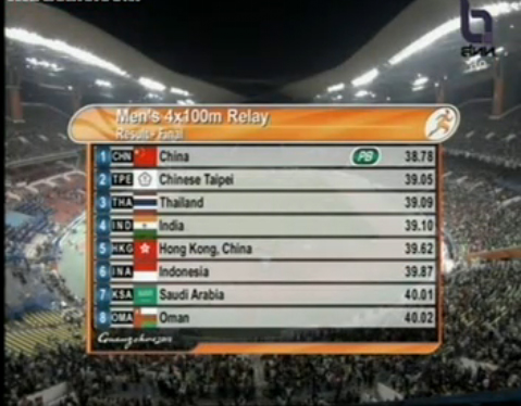 วิ่งผลัด 4 คูณ 100 เมตรชาย ไทยลงฮีตที่ 2 ทำเวลาได้ 39.57 วินาที ขณะที่จีนเข้าที่ 1 สถิติ 39.03 วินาที หากรวมเวลาสองฮีตแล้วไทยตามหลัง จีน และไต้หวัน ยังสามารถผ่านเข้ารอบชิงชนะเลิศได้ ส่วนตัวเต็งอย่างญี่ปุ่น รับไม้พลาดไม่ผ่านเข้าชิงชนะเลิศ