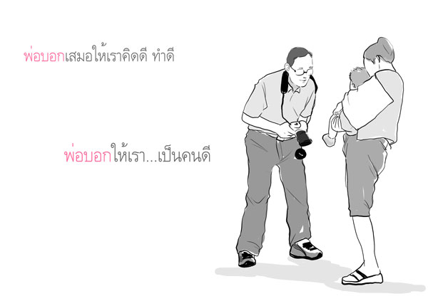 พ่อหลวง พร่ำบอกพร่ำสอนในหลาย ๆ เรื่อง ให้คนไทยคิดดี ทำดี อดทน ขยันหมั่นเพียร สามัคคี และพอเพียง
