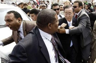 โดยกลุ่มผู้ภักดีต่อกัดดาฟีราว 50 คนถือภาพของ พันเอก กัดดาฟี รุมเข้าไปตะโกนด่า นาย บันกีมุน อย่างย่อยยับ ด้านเจ้าหน้าที่รักษาความปลอดภัย ต้องรีบกันตัวเลขาธิการยูเอ็นออกไปยังที่ประชุมสหพันธ์ชาติอาหรับในทันที และหลังจากการประชุมแล้ว ขบวนรถของ นาย บันกีมุน ยังเจอม็อบชาวอียิปต์ที่เดินขบวนเรียกร้องรัฐบาลอีก