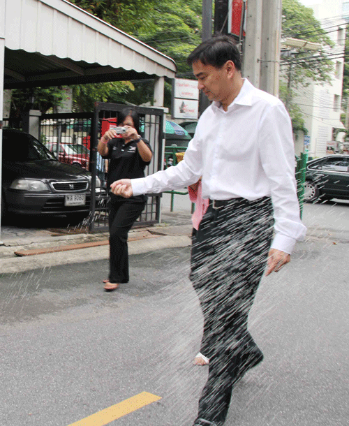 อภิสิทธิ์ กำข้าวสารสาดปัดรังควานระหว่างการทำพิธีบวงสรวงแม่พระธรณีฯ ก่อนหน้านี้คนเสื้อแดงเคยนำเลือดมาราดบริเวณหน้าที่ทำการพรรค
