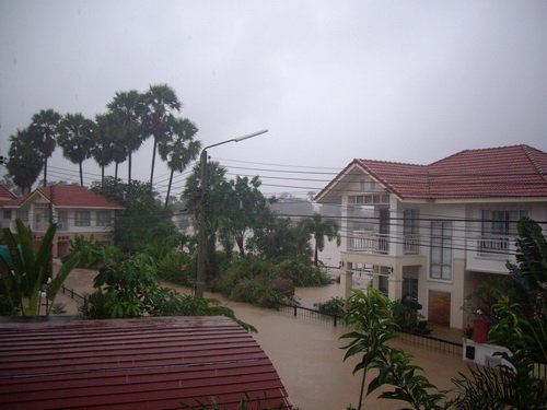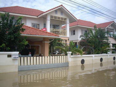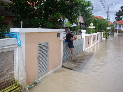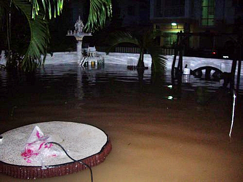 เวลา ประมาณ 16.00 น. น้ำท่วมถนนภายในหมู่บ้านทุกถนนแล้ว มีน้ำซึมผ่านบานเหล็กที่ประตูรั้วเข้ามาในบ้านของผมปริมาณหนึ่ง แต่เมื่อเปิดเครื่องสูบน้ำก็สามารถควบคุมระดับน้ำไม่ให้สูงจนเกิดความเสีย หายได้ เมื่อน้ำในถนนลดลง ผมไม่ต้องลำบากในการทำความสะอาดบริเวณบ้าน ที่มีดินโคลนตกค้างจากน้ำท่วมขัง เหมือนน้ำท่วมเมื่อครั้งก่อนอีกแล้ว