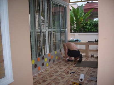 ติดตั้งเสาเหล็กฉากทั้ง 2 ด้าน ใช้สกรูตัวไม่ต้องใหญ่มาก (ถอดเก็บง่าย) เว้นระยะให้เหมาะสม พร้อมยิงซิลิโคนด้านนอกให้เรียบร้อย