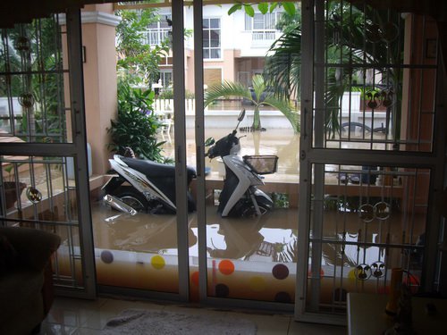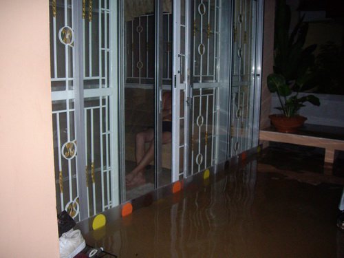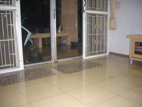 ขณะที่ถนนด้าน นอกระดับน้ำสูงถึง 60 ซม. แต่ภายในบ้านมีน้ำรั่วซึมเข้ามาเพียงเท่านี้ และเมื่อเปิดเครื่องสูบน้ำ น้ำก็จะแห้งภายใน 5 นาที