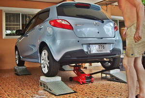 ภาพด้านซ้ายคือ ภาพรถที่ไม่ได้ป้องกันน้ำท่วม ส่วนภาพด้านขวาเลยหาคันยก และยกให้สูงขึ้น