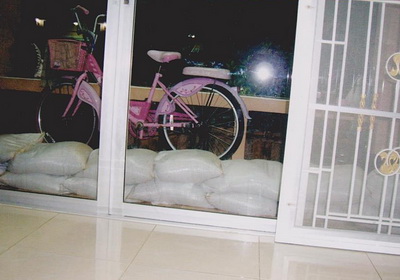 เตรียมการก่อนประสบการณ์ จากน้ำท่วมเมื่อครั้งที่แล้ว พบว่าถึงแม้จะกั้นกระสอบทรายไว้ที่ประตูรั้ว แต่ก็ไม่สามารถกั้นน้ำเข้าบ้านได้ เพราะ (1) บริเวณสนามหญ้าและลานอิฐบล็อกภายในบริเวณบ้านจะมีน้ำปุดทะลุพื้นดินขึ้นมา (2) กระสอบทรายไม่มีความมั่นคงแข็งแรงเพียงพอ เมื่อถูกคลื่นที่เกิดจากรถยนต์วิ่งฝ่าเข้ามาในถนนที่น้ำท่วม จะมีแรงดันมหาศาลทำให้กำแพงกระสอบทรายพัง และน้ำไหลเข้าบริเวณบ้านได้ในที่สุด