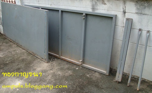 - หลังจากนั้นก็ยกแผ่นบานเหล็กอีกแผ่นหนึ่ง ค่อย ๆ สวมลงไปในกรอบรางเหล็ก และติดตั้งเสาค้ำยันที่เหลือ แต่ถ้าต้องประกอบด้วยตนเองเพียงคนเดียว ควรยกแผ่นบานเหล็กอีกแผ่นหนึ่งวางเข้าไปในรางเหล็กก่อน แล้วจึงนำเสากลางเสียบลงไปจากด้านบน ในระหว่างรอยต่อของแผ่นเหล็กแต่ละบาน จะเบาแรงกว่ากันมาก แล้วก็อย่าลืมอุดดินน้ำมัน(หรือพ่นซิลิโคน) ในจุดรอยต่อให้ทั่วถึงด้วยนะ
