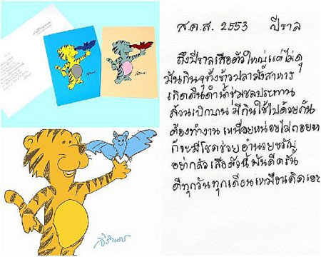 ในช่วงปีใหม่ ปี 2553 ซึ่งตรงกับปีขาล สมเด็จพระเทพรัตนราชสุดาฯ สยามบรมราชกุมารี ได้พระราชทาน ส.ค.ส. ลายพระหัตถ์รูปเสือจับค้างคาว พร้อมกับลงพระปรมาภิไธยย่อ สิรินธร และพระราชทานพรปีใหม่เป็นบทกวี ใจความว่า