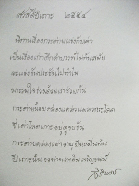 ในช่วงปีใหม่ ปี 2554 ซึ่งตรงกับปีเถาะ สมเด็จพระเทพรัตนราชสุดาฯ สยามบรมราชกุมารี ได้พระราชทาน ส.ค.ส. ลายพระหัตถ์รูปกระต่ายขี่เต่า พร้อมกับลงพระปรมาภิไธยย่อ สิรินธร และพระราชทานพรปีใหม่เป็นบทกวี ใจความว่า