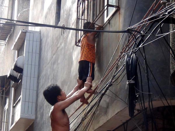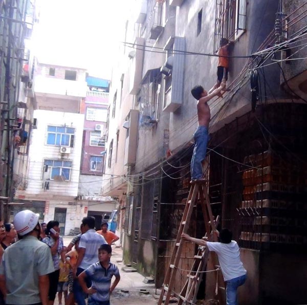 เหตุการณ์นี้เกิดขึ้นในเมืองฟางเฉิงกัง มณฑลกวางสีของจีน เด็กชายวัย 3 ขวบรายหนึ่งซึ่งไม่ได้รับการเปิดเผยชื่อ ได้ซุกซนปีนหน้าต่างบ้านชั้น 2 ออกมา ระหว่างที่พ่อแม่ไม่อยู่บ้าน และเกิดพลัดตกลงมาจากหน้าต่าง แต่ร่างของเขาไม่ได้ตกลงมากระแทกพื้นเบื้องล่างแต่อย่างใด กลับห้อยต่องแต่ง คอติดอยู่กับลูกกรงที่สูงเหนือพื้นราว ๆ 6 เมตร และโชคดีที่มีชาวบ้านที่อาศัยอยู่ละแวกนั้นสังเกตเห็นหนูน้อยรายนี้กำลังห้อยอยู่นอกหน้าต่างพอดี จึงรีบนำบันไดลิงมาปีนขึ้นไปช่วยเหลือ โดยจับขาพยุงหนูน้อยไว้ เพื่อทานน้ำหนักของหนูน้อยอยู่ราว ๆ 20 นาที ก่อนที่เจ้าหน้าที่ดับเพลิงจะมาถึง และเข้าช่วยเหลือหนูน้อย ด้วยการดึงตัวหนูน้อยจากภายในห้อง และในที่สุดหนูน้อยก็ได้รับการช่วยเหลือขึ้นมาอย่างปลอดภัย