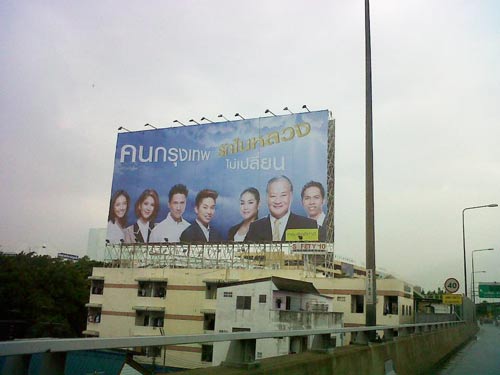 เป็นประเด็นที่ถูกวิพากษ์วิจารณ์อย่างมากขณะนี้ เกี่ยวกับป้ายโฆษณาขนาดใหญ่ที่ติดตั้งบนอาคารสูงริมถนนสายหลักหลายสาย โดยมีใจความว่า "คนกรุงเทพ รักในหลวง ไม่เปลี่ยน" ทั้งนี้ในป้ายดังกล่าวมีรูปของ "ม.ร.ว.สุขุมพันธุ์ บริพัตร" ผู้ว่าราชการกรุงเทพมหานคร อยู่รวมกับบรรดาศิลปิน นักร้อง นักแสดง และนักกีฬาชื่อดัง ซึ่งผู้ที่เห็นภาพดังกล่าว ส่วนมากจะวิจารณ์ในแง่ลบ เนื่องจากคิดว่าป้ายโฆษณานั้น เป็นการหาเสียงการเลือกตั้งผู้ว่าฯ สมัยหน้าของ ม.ร.ว.สุขุมพันธุ์ ที่ได้ประกาศว่าจะลงสมัครเพื่อรักษาแชมป์สมัยที่ 2 และเป็นเรื่องที่ไม่ถูกต้องที่นำเอาสถาบันพระมหากษัตริย์มายุ่งเกี่ยวกับการเมือง