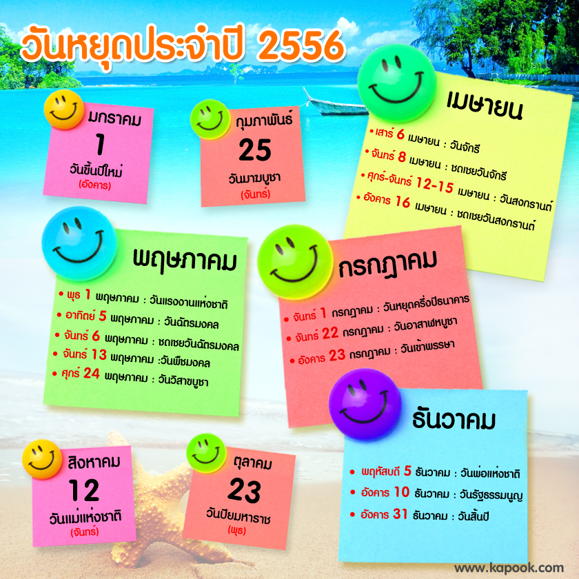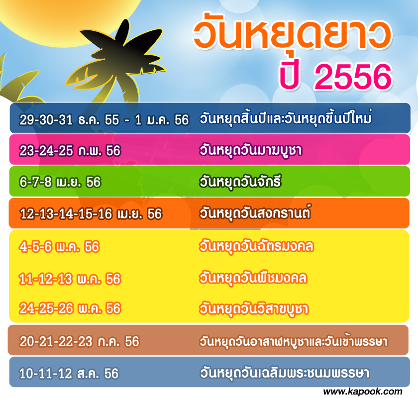 หวังว่า ปฏิทินวันหยุดปี 2556 นี้ จะเป็นประโยชน์แก่ทุกคน และขอให้ทุกคนได้ร่วมสนุกกับกิจกรรมในช่วงวันหยุดที่กำลังจะมาถึงนี้กันอย่างสนุกสนานนะจ๊ะ