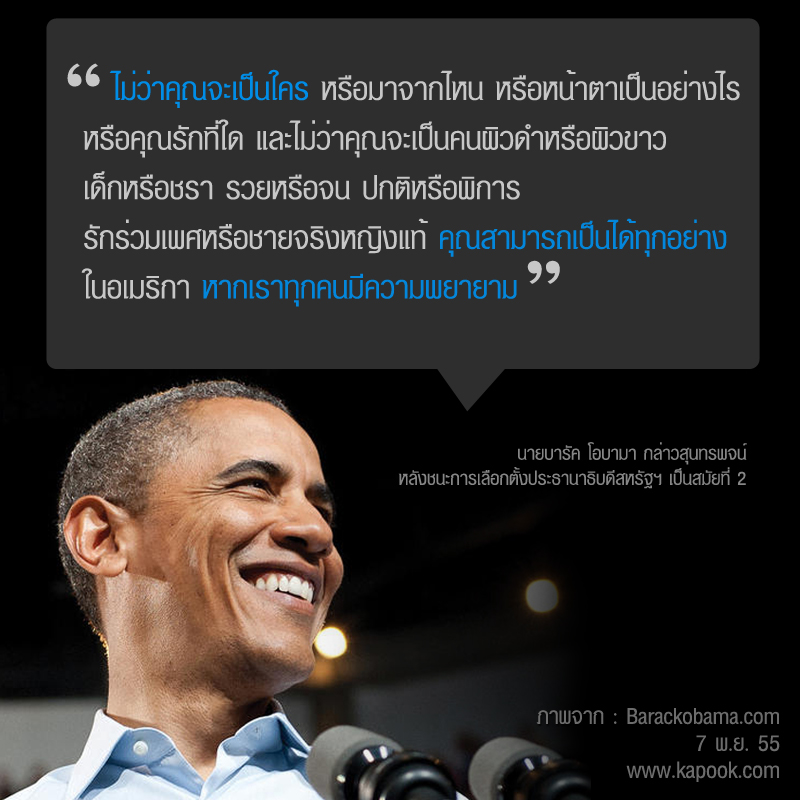 "ผมได้คุยกับมิตต์ รอมนีย์ แล้ว เพื่อแสดงความยินดีที่ได้พ้นผ่านการหาเสียงที่ดุเดือดมาด้วยกัน ซึ่งถึงแม้ว่าเราจะเป็นคู่แข่งในการชิงเก้าอี้ประธานาธิบดีครั้งนี้ แต่นั่นเป็นเพราะเราต่างรักอเมริกา เป็นห่วงอนาคตของอเมริกาเหมือนกัน และในอีกไม่กี่สัปดาห์ข้างหน้า ผมกับรอมนีย์ก็จะพูดคุยกันเกี่ยวกับการพัฒนาประเทศ เพื่อที่จะจับมือกันพาอเมริกาเดินก้าวไปข้างหน้า ประชาชนชาวอเมริกันทุกคน เราเหมือนเป็นครอบครัวเดียวกัน ไม่ว่าต่อไปนี้เราจะทำอะไร จะไปที่ไหน เราจะหอบเอาความทรงจำ สิ่งที่เราเคยสร้างมันมาด้วยกันไปด้วย และคุณจะไม่ผิดหวังกับประธานาธิบดีคนนี้ ขอบคุณที่เชื่อมั่น ไม่ว่าจะต้องเจออะไร พวกคุณจะเป็นกำลังใจของผม และผมจะยินดีกับทุก ๆ อย่างที่ชาวอเมริกันได้ทำ"