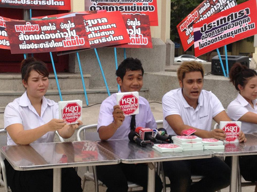 นักศึกษาหลายสถาบันร่วมรณรงค์ให้คนไทยติดริบบิ้นสีเขียว เปิดไฟหน้ารถ เพื่อต่อต้านแนวคิดแช่แข็งประเทศไทยของ เสธ.อ้าย พร้อมออกแถลงการณ์ต้านแช่แข็งประเทศ