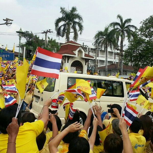 พระบาทสมเด็จพระเจ้าอยู่หัว ทรงมีพระพักตร์แจ่มใส ทรงแย้มพระโอษฐ์ให้กับประชาชนที่มาเฝ้าฯ รอรับเสด็จฯ บริเวณชั้นล่างของอาคารเฉลิมพระเกียรติ โดยต่างเปล่งเสียงทรงพระเจริญอย่างกึกก้อง รวมทั้งหลั่งน้ำตาด้วยความปลื้มปิติที่ได้ชื่นชมพระบารมีอย่างใกล้ชิด