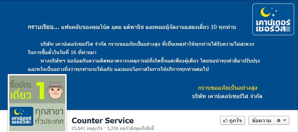 ขณะที่เคาน์เตอร์เซอร์วิส ก็ขอยอมรับผิดในกรณีดังกล่าวด้วยเช่นกัน โดยมีการชี้แจงผ่าน เฟซบุ๊ก Counter Service เอาไว้ดังนี้