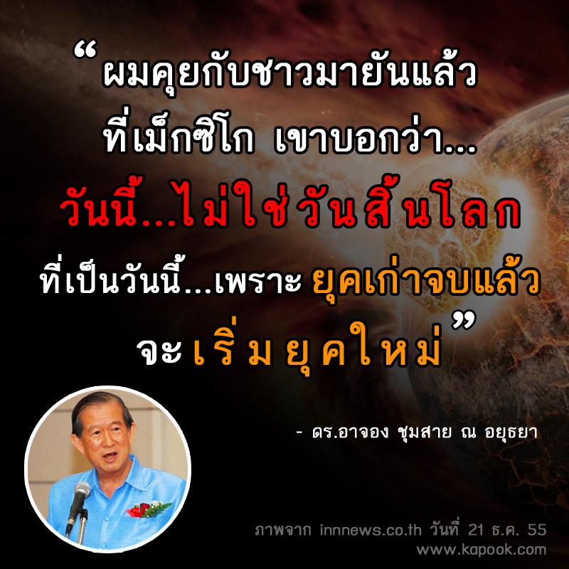 ดร.อาจอง เผย วันนี้ไม่ใช่วันสิ้นโลก เพราะไม่พบพายุสุริยะ ยัน คุยกับชาวมายันแล้ว แค่เขียนปฏิทินวันสุดท้าย ขออย่าตระหนก